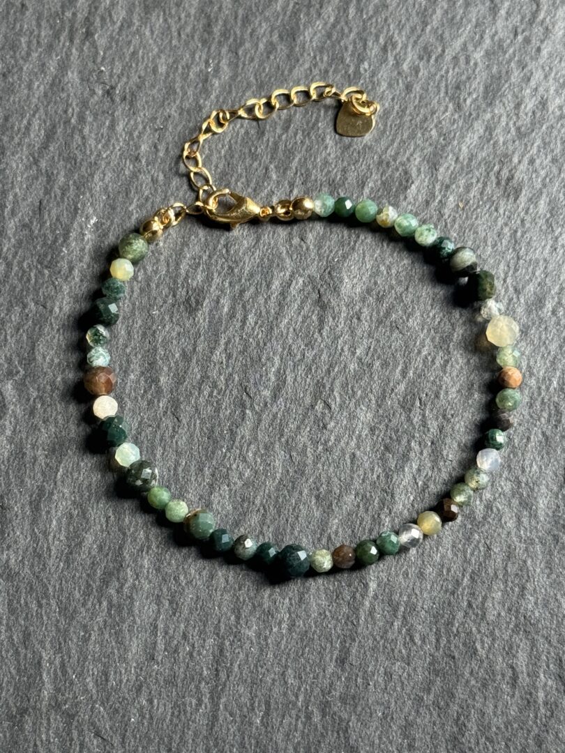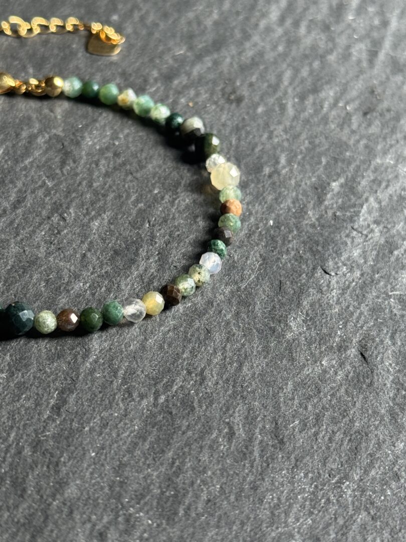 Każdy koralik został starannie dobrany, dzięki czemu biżuteria zachwyca naturalnym pięknem i niepowtarzalnością. Złote akcenty dodają całości elegancji, a otwarte zapięcie zapewnia wygodę noszenia.
