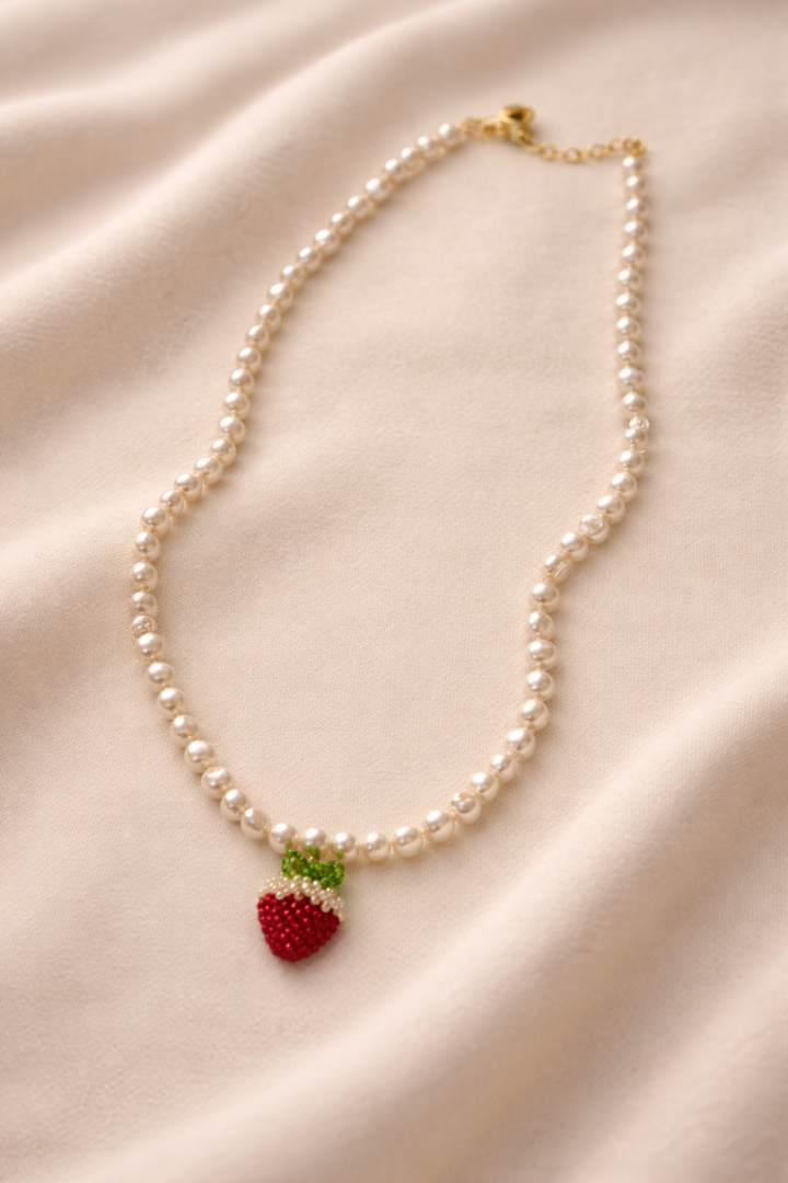 Delikatny i uroczy naszyjnik, który łączy klasyczną elegancję z nutą dziewczęcego wdzięku. Wykonany z naturalnych pereł słodkowodnych, zachwyca subtelnym blaskiem i ponadczasowym charakterem. Centralnym punktem jest ręcznie wykonana zawieszka w kształcie truskawki, która dodaje całości wyjątkowego, oryginalnego akcentu.