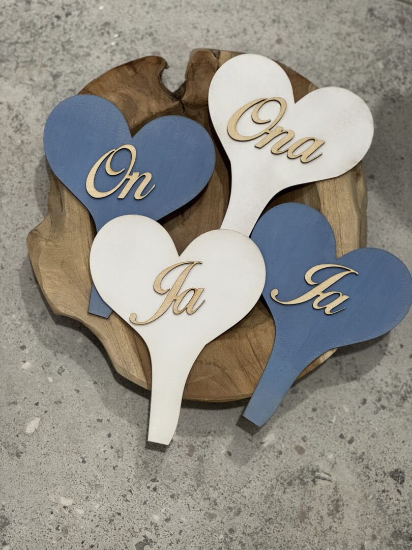 Zestaw zawiera 4 tabliczki- dwie dla pana młodego ( JA, ONA) oraz dwie dla pani młodej (JA, ON)