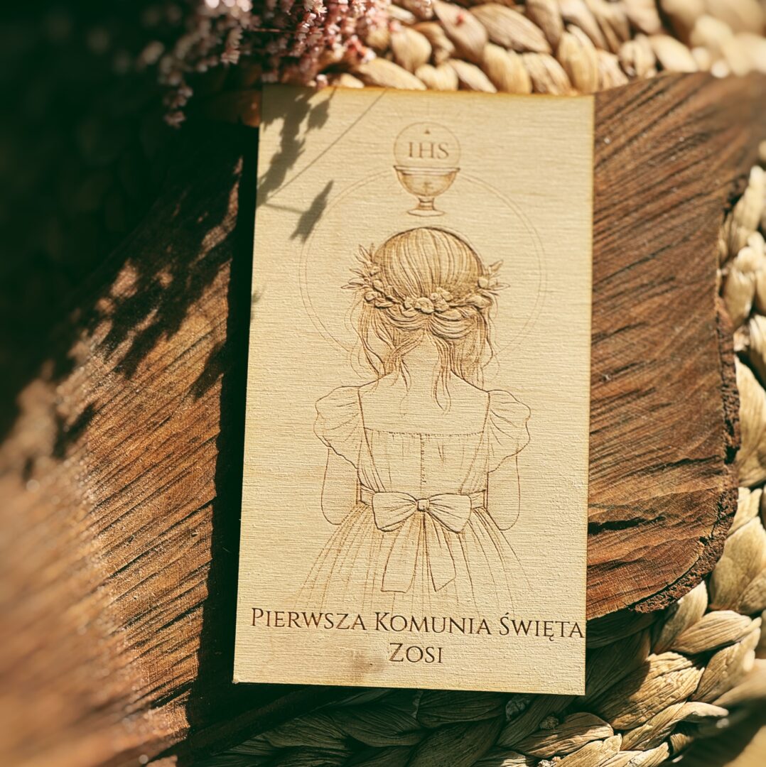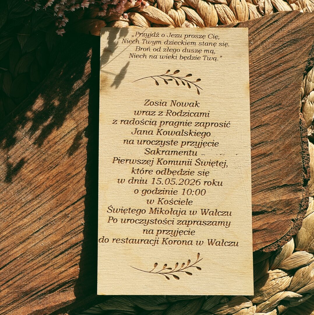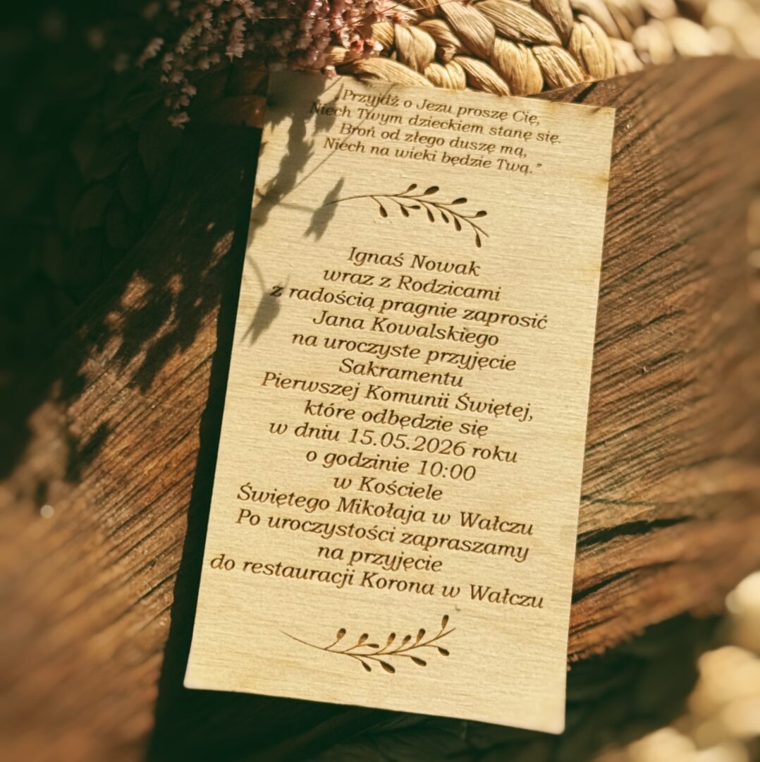Drewniane zaproszenia na Pierwszą Komunię Świętą