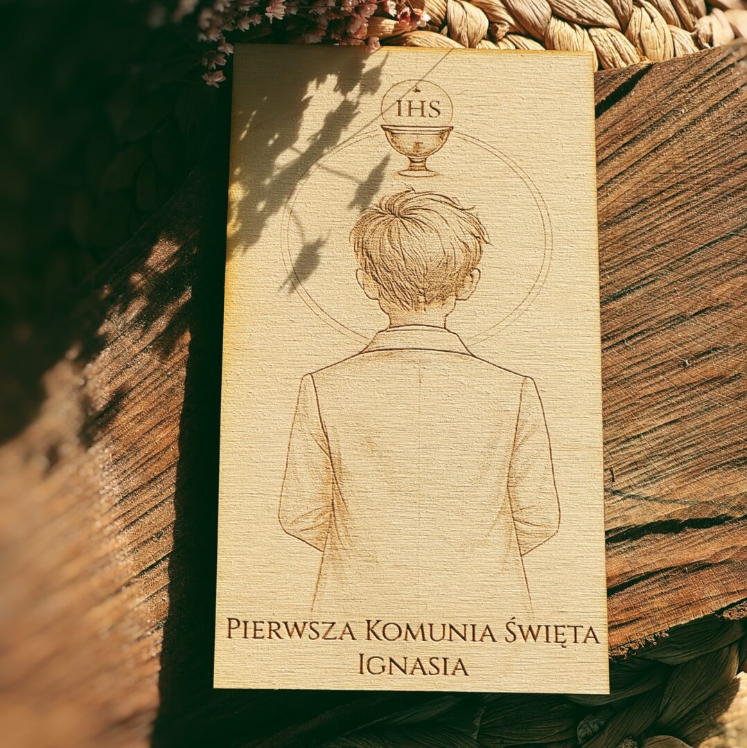 Wyjątkowe, grawerowane zaproszenia komunijne wykonane na naturalnej sklejce o wymiarach 10×15 cm. Subtelny, minimalistyczny wzór z motywem dziewczynki lub chłopca oraz symbolem IHS nadaje całości elegancki i ponadczasowy charakter.